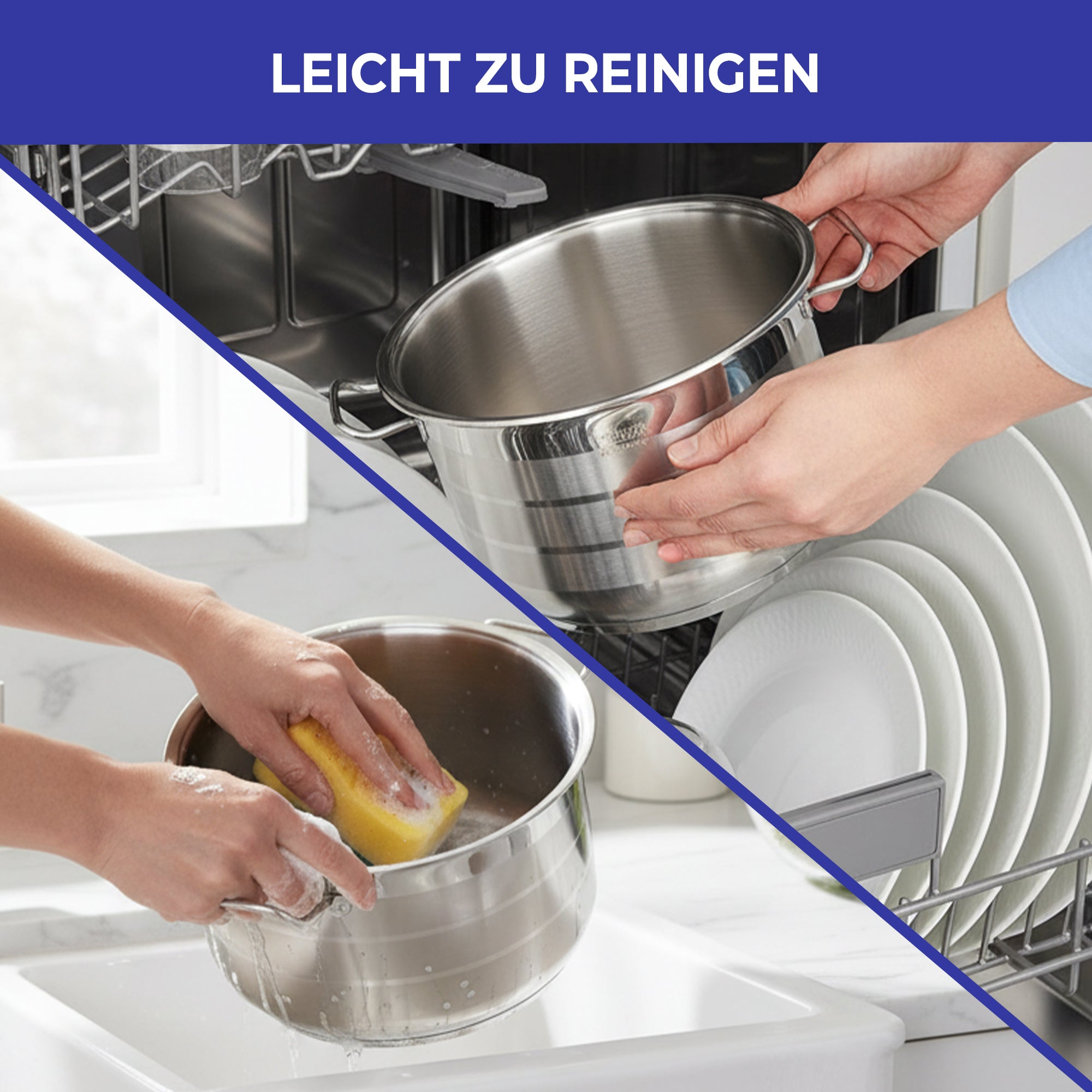 Dank der glatten Oberfläche sind die Töpfe leicht zu reinigen und können problemlos in der Spülmaschine gereinigt werden. Die ergonomischen Edelstahlgriffe bleiben stabil und sicher in der Hand.