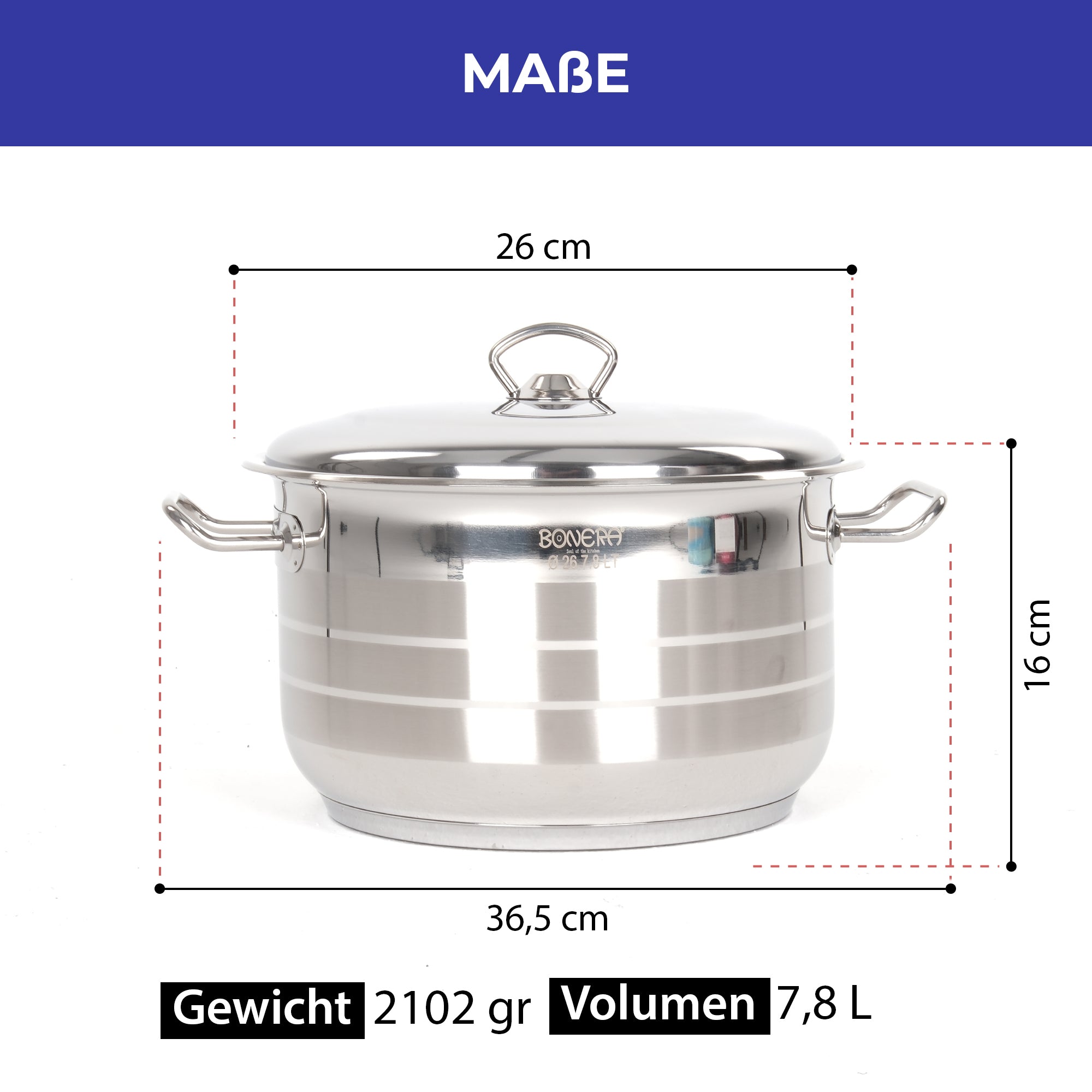 26×16 cm – Gewicht: ca. 2464 g – Volumen: 8 L