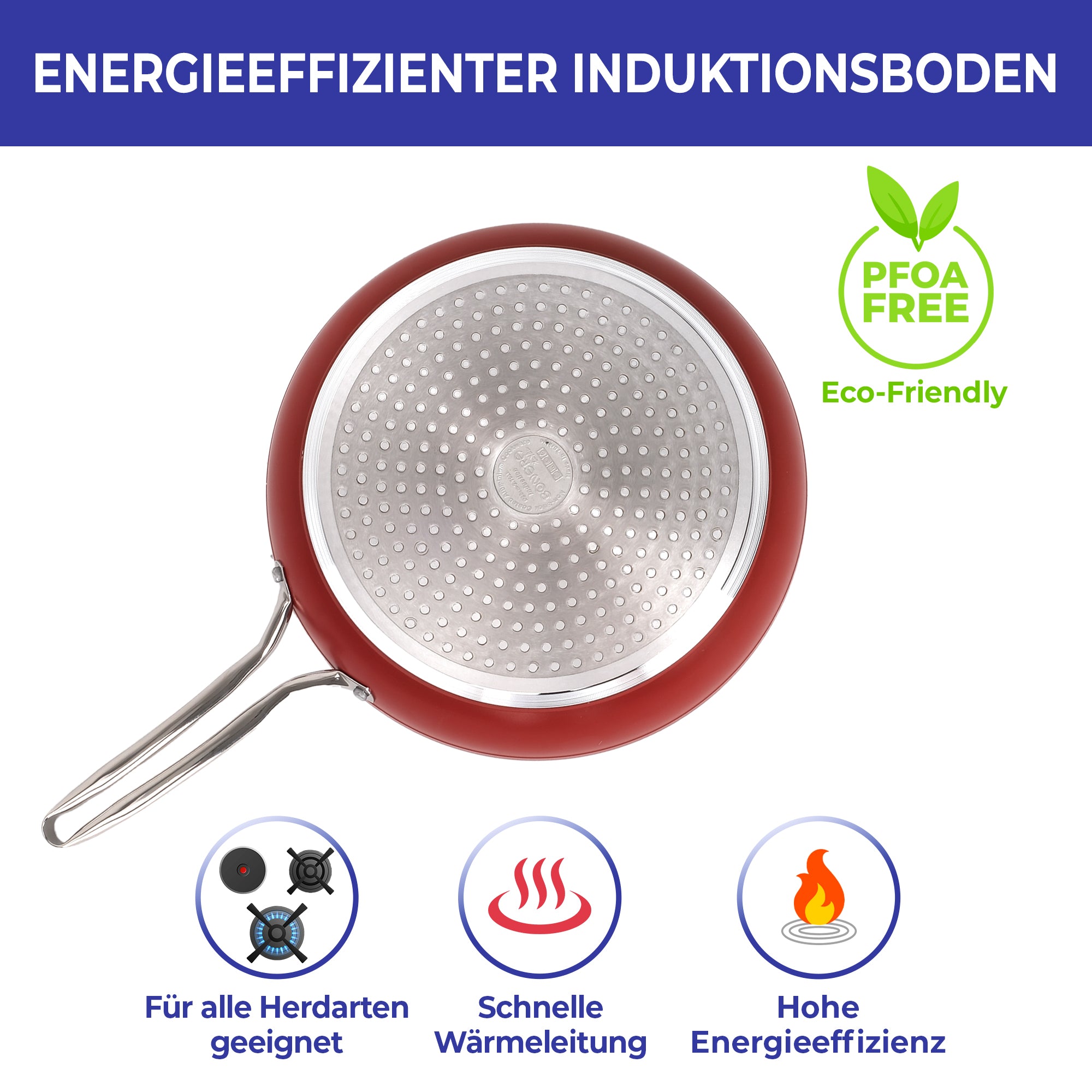 Der energieeffiziente Induktionsboden gewährleistet eine optimale Hitzeübertragung auf allen Herdarten. Der ergonomisch geformte Metallgriff liegt angenehm in der Hand, bietet sicheren Halt und ist besonders langlebig.