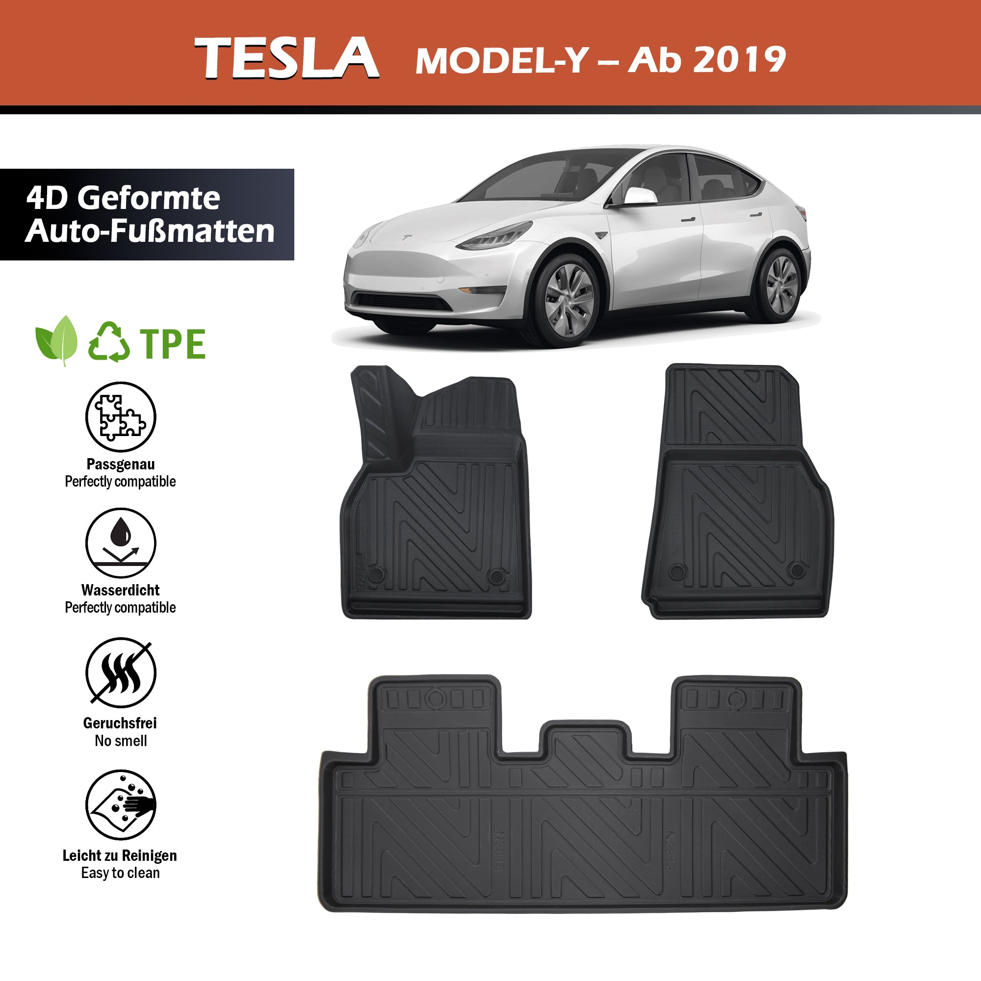 Fußmatten Set für Tesla 2019 4-teiliges 3D Auto-Fußmatten-Set – Universell | Hoher Rand | Zuschneidbar | Rutschfest | Ganzjahrestauglich