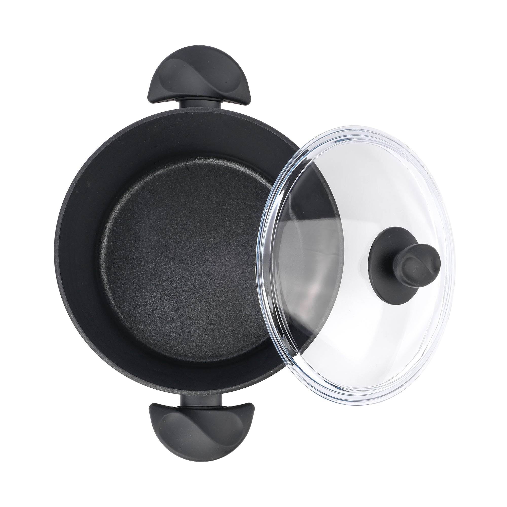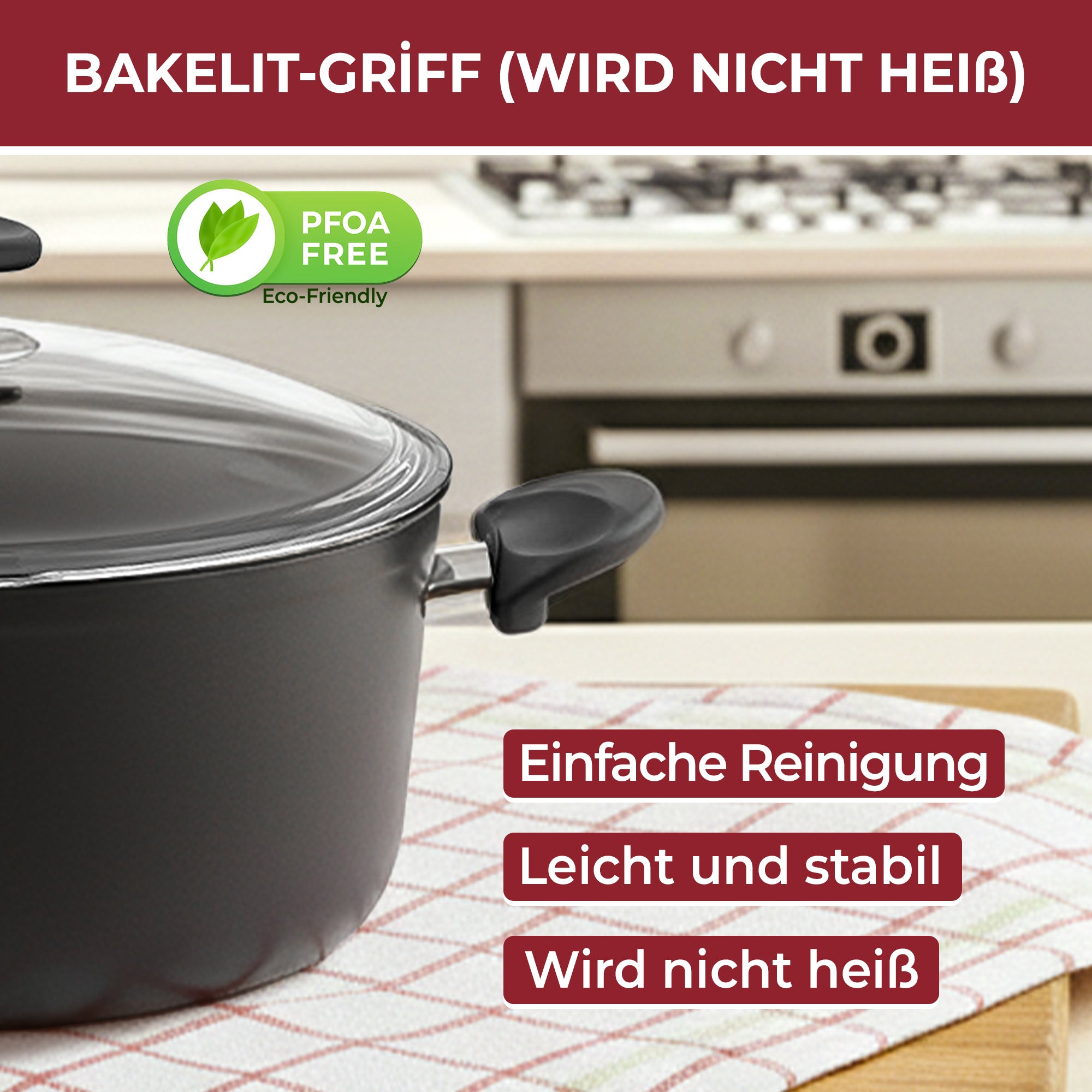 Der hitzebeständige Glasdeckel erlaubt eine komfortable Sichtkontrolle während des Kochens, ohne den Deckel anheben zu müssen. Die ergonomisch geformten Bakelit-Griffe bleiben auch bei hohen Temperaturen angenehm kühl und bieten sicheren Halt.
